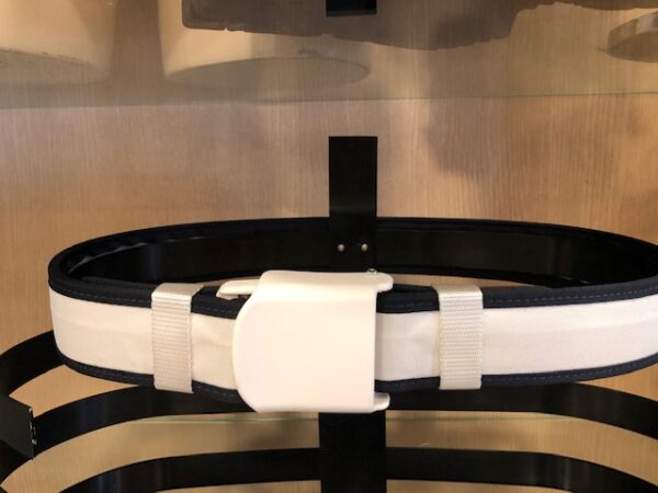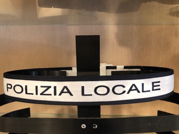 Cinturone in cordura bianca, con ricamo blu Polizia Locale e bordo in cotone blu. Altezza 5 cm.