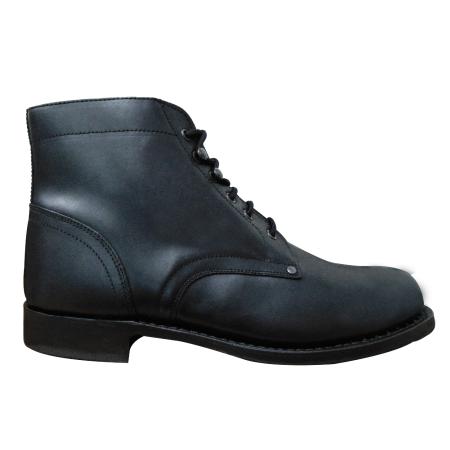 Calzatura alta, con tomaia in pelle fiore idrorepellente. Fodera interna di vitello. Puntale in tela, suola in cuoio con piantina di gomma anti-scivolo. Lavorazione “Ago”.